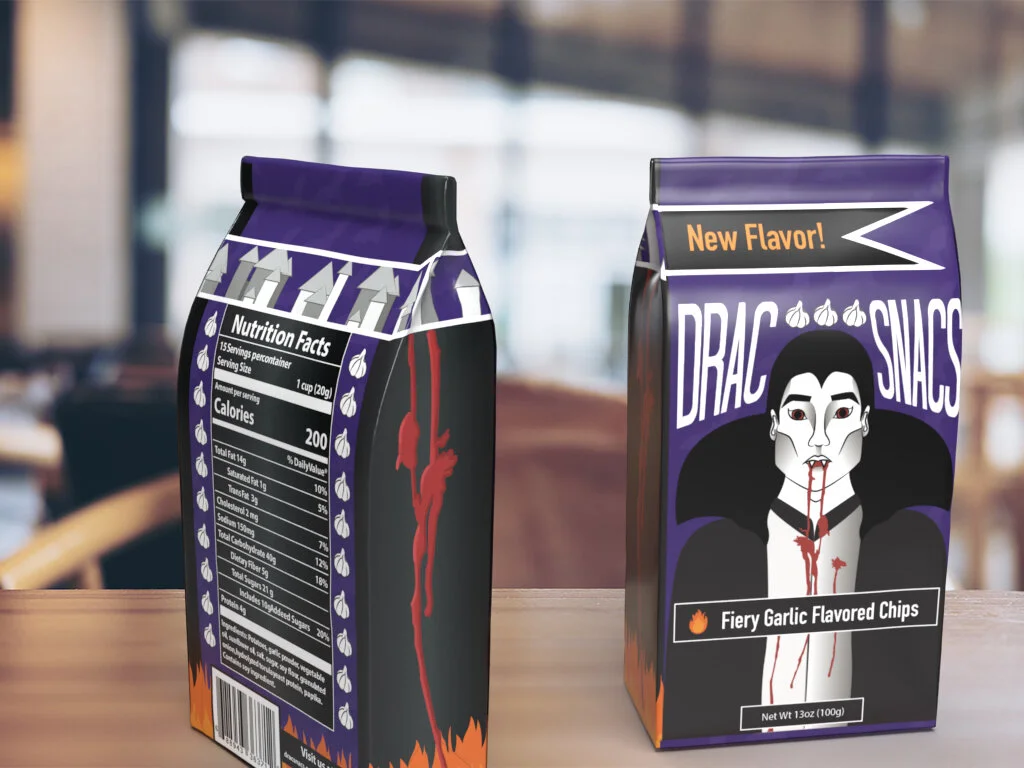 This was a project inspired by Halloween and the essence of Dracula. The project was inspired by Halloween/All Hallows Eve and made into a holiday-based chip bag based on that afterward. The castles in the background refer to the historical imprisonment prior to death in a fire of Vladimir the Impaler whom the character Dracula is based off of. The flavor of the chips is also a play on the fact that Dracula is infamously allergic to/weak at the presence of garlic.