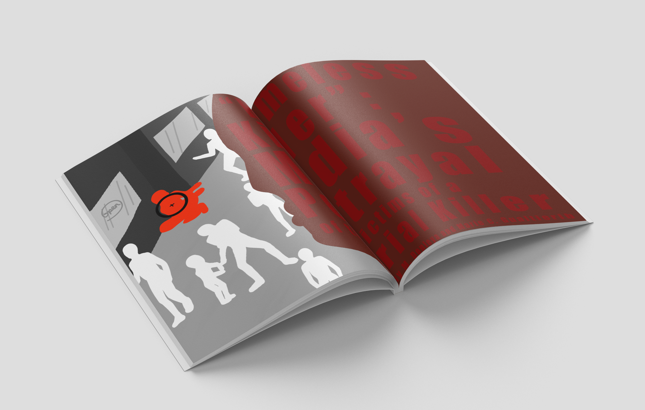 This piece itself is an embodiment of multiple interests of mine, whether that be my passion for design or my casual interest in the psyche. While this entire piece has a focus on serial killers, the articles included also have an emphasis on society perceives them as well. It is not to discourage any opinions or perspectives on the killers, but rather to stimulate a more developed opinion. While serial killers are a fascinating topic for a lot of people, most people primarily only see them from the perspective of storytelling or media-promoted perspectives which exaggerate certain factors and omit others. The intent of a magazine is to remain interesting in content as well as visuals so that the reader feels compelled to view the entire work. This piece has a compilation of the overlooked topics and information while also intending to remain visually interesting and appealing for viewers.